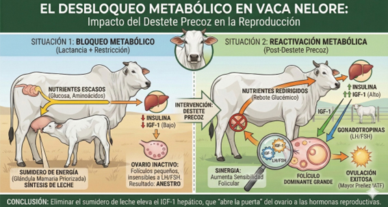 Al realizar el destete precoz (separación definitiva a los 60-90 días), se elimina el estímulo de succión. La desaparición del freno opioide permite, en un lapso de 2 a 5 días, el restablecimiento de la pulsatilidad de lh. Si la condición corporal es adecuada (o mejora rápidamente tras el destete), esta lh induce la ovulación de un folículo dominante, reiniciando la ciclicidad.